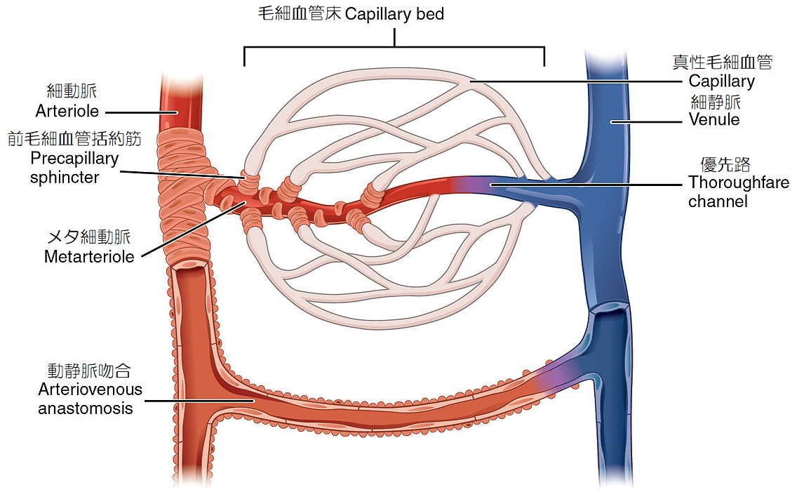 また、細動脈からそのまま細静脈に繋がっている動静脈吻合どうじょうみゃくふんごう(グロムス装置、AVA血管)と呼ばれる部分もあり、こちらは毛細血管を通らないため、細胞との物質交換を行いません。