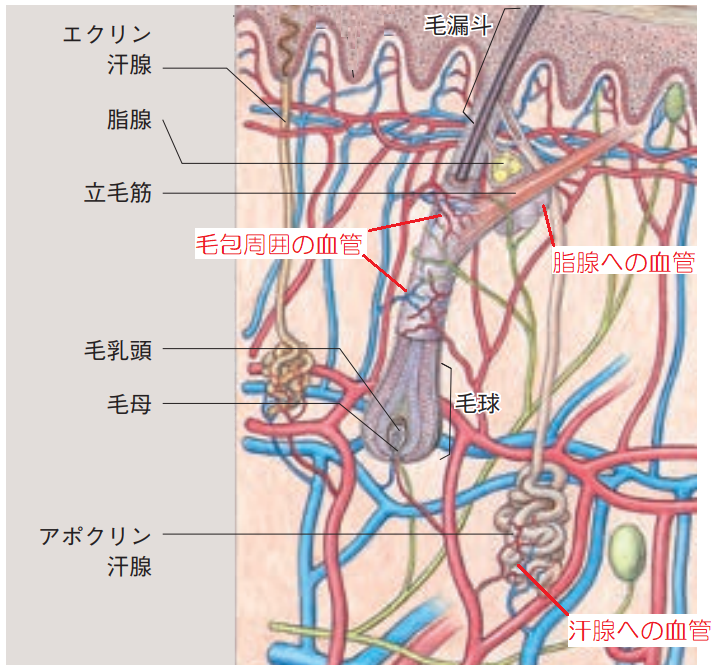 また、毛細血管は、真皮や皮下組織の毛包や脂腺、汗腺などの付属器周囲にも張り巡らされ、血液を供給することで、細胞活動に必要な酸素や栄養素を届けています。