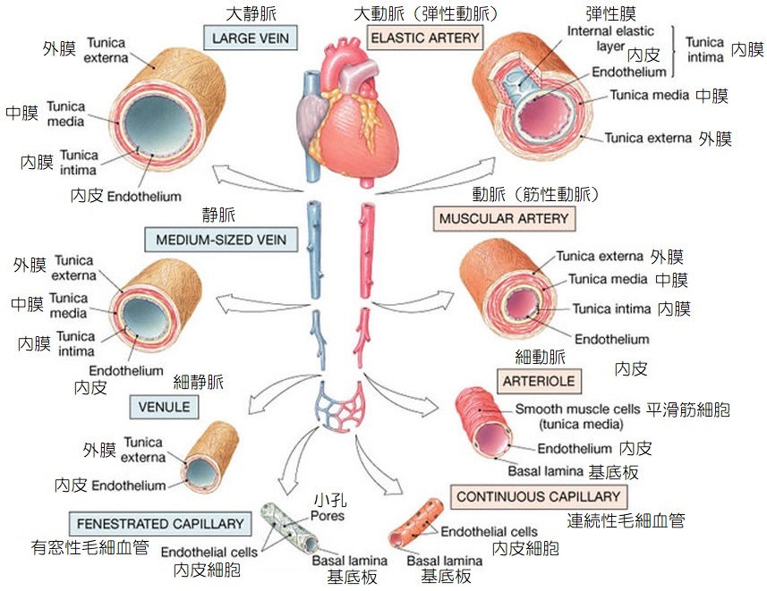 血管の構造は、一番外側を覆う外膜(疎性結合組織)、その内側の中膜(平滑筋と弾性線維)、そして血管の内壁である内膜(内皮細胞と結合組織)の3層構造になっています。