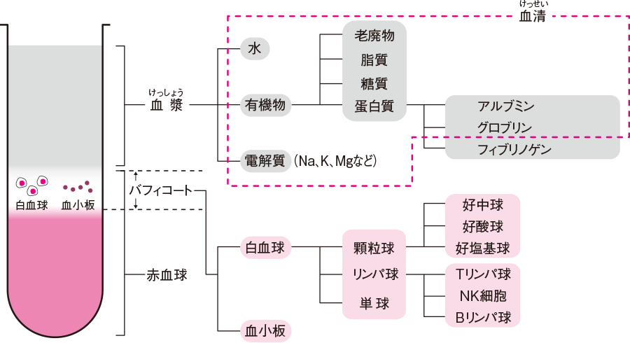 細胞成分は、その99%以上が酸素を運ぶための赤血球で、残りは免疫を司る顆粒球・リンパ球などの白血球や、損傷した血管を塞ぐ役割を担う血小板です。