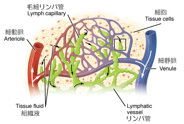 こられの老廃物を含んだ間質液は再び毛細血管に入り、静脈系へと流れますが、毛細血管に入りきらなかった一部の間質液や、分子の大きなタンパク質は毛細リンパ管に入ります。