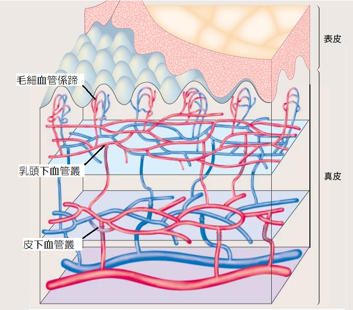 ▲皮膚を流れる毛細血管網(引用:あたらしい皮膚科学第1版)