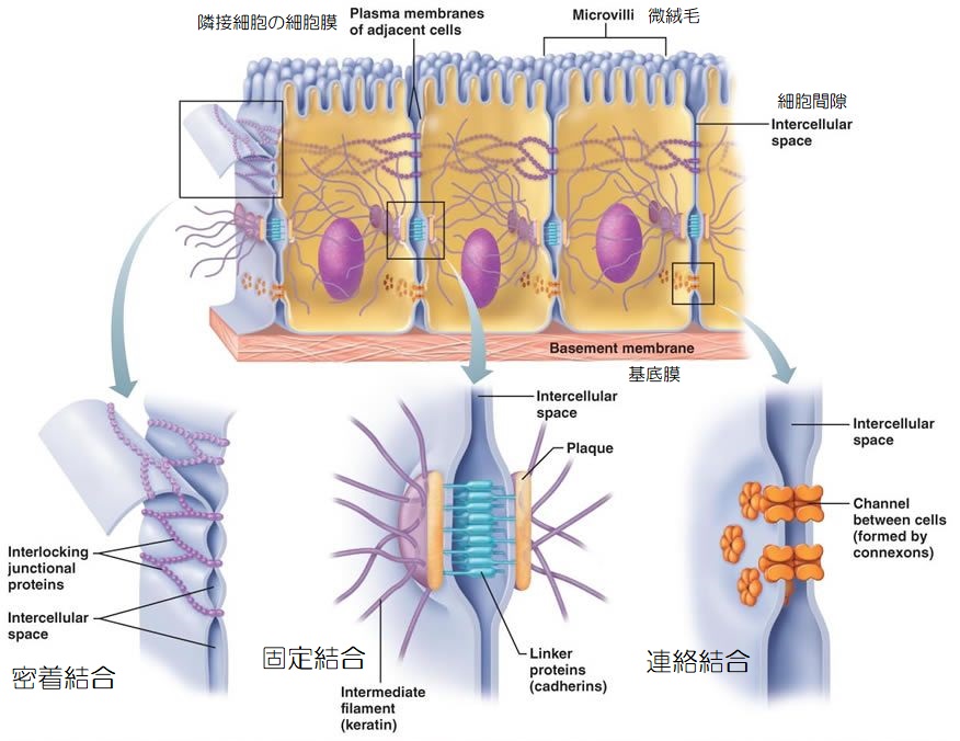 細胞接着には、大まかに密着結合、固定結合、連絡結合に分けられ、異物の侵入を防いだり、細胞どうしの物質のやり取りを担う働きもあります。