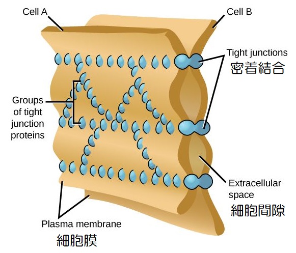 密着結合を構成するのは、クローディンやオクルディンという、細胞膜を貫通して隣の細胞と結合しているタンパク質で、これが網目状に幾重にも張り巡らされています。