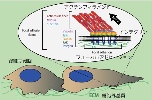 そして、細胞内ではアクチンフィラメントや中間径フィラメントなどの細胞骨格とも結合することにより、細胞外からの力に対抗する働きを担っています。