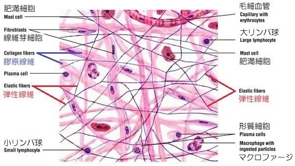 ▲真皮を構成する線維や細胞(引用:easy notecards)