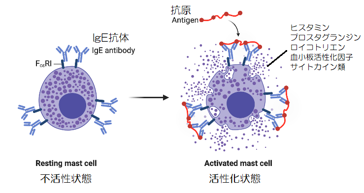 肥満細胞の細胞表面のIgE受容体に、形質細胞から放出されたIgE抗体が結合すると、異物に対し敏感に反応する「感作状態」になります。