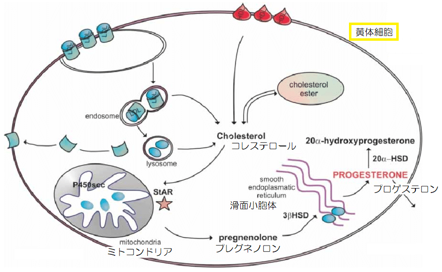 排卵後の卵胞は、残された莢膜細胞と顆粒膜細胞が黄体細胞に変化し、下垂体のLHの作用により、黄体内で毛細血管が新生され、コレステロールの流入が増えます。