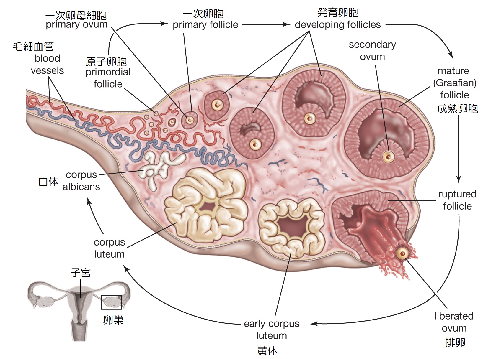 卵子を包んでいるのが卵胞(濾胞)であり、卵胞は卵巣内で徐々に発育し、原子卵胞、発育卵胞(一次卵胞、二次卵胞)、成熟卵胞、閉鎖卵胞などと、その名称を変えます。