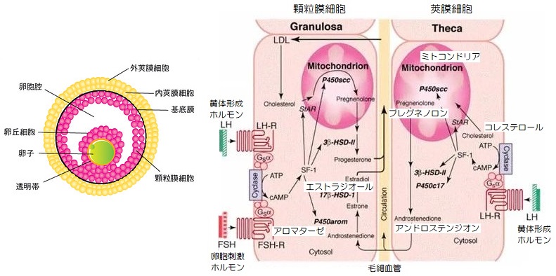卵胞は、外側の莢膜細胞と内側の顆粒膜細胞、卵胞腔、卵子を囲む卵丘細胞、そして卵子からなり、莢膜細胞でアンドロゲンが、顆粒膜細胞でエストロゲンが生成されます。