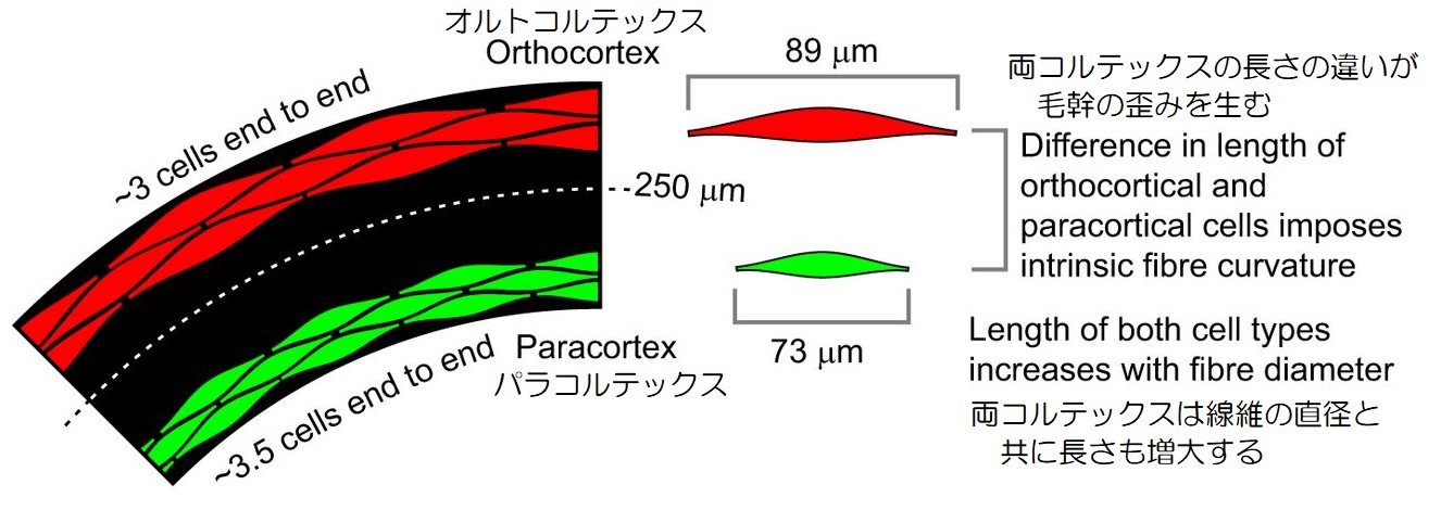 つまり、くせ毛はカールの外側にオルトコルテックス細胞が多く、カールの内側にパラコルテックス細胞が多いという、偏った配置になっているのです。
