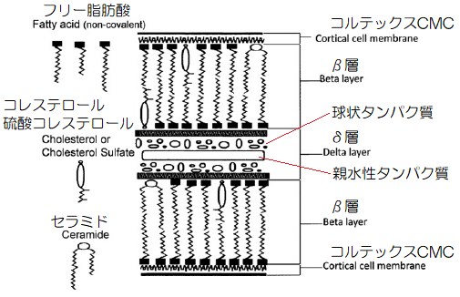キューティクル細胞同士を繋ぐキューティクルCMCと同じく、中央のδ層は非ケラチンタンパク質の親水性タンパク質や天然保水因子などで、水分や薬剤の通り道となっています。