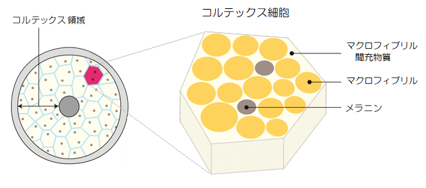 1つのコルテックス細胞は、幅4μm、高さ100μmという非常に細長い形状をしていて、内部はケラチン線維の束であるマクロフィブリルが数個~数十個ほど縦に並んでいます。