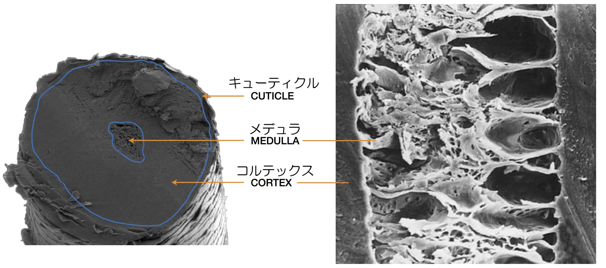 コルテックス細胞は規則的に配列され、縦方向ではジスルフィド結合により強固に結合していますが、横の配列はコルテックスCMCのため接着力が幾分弱くなっています。