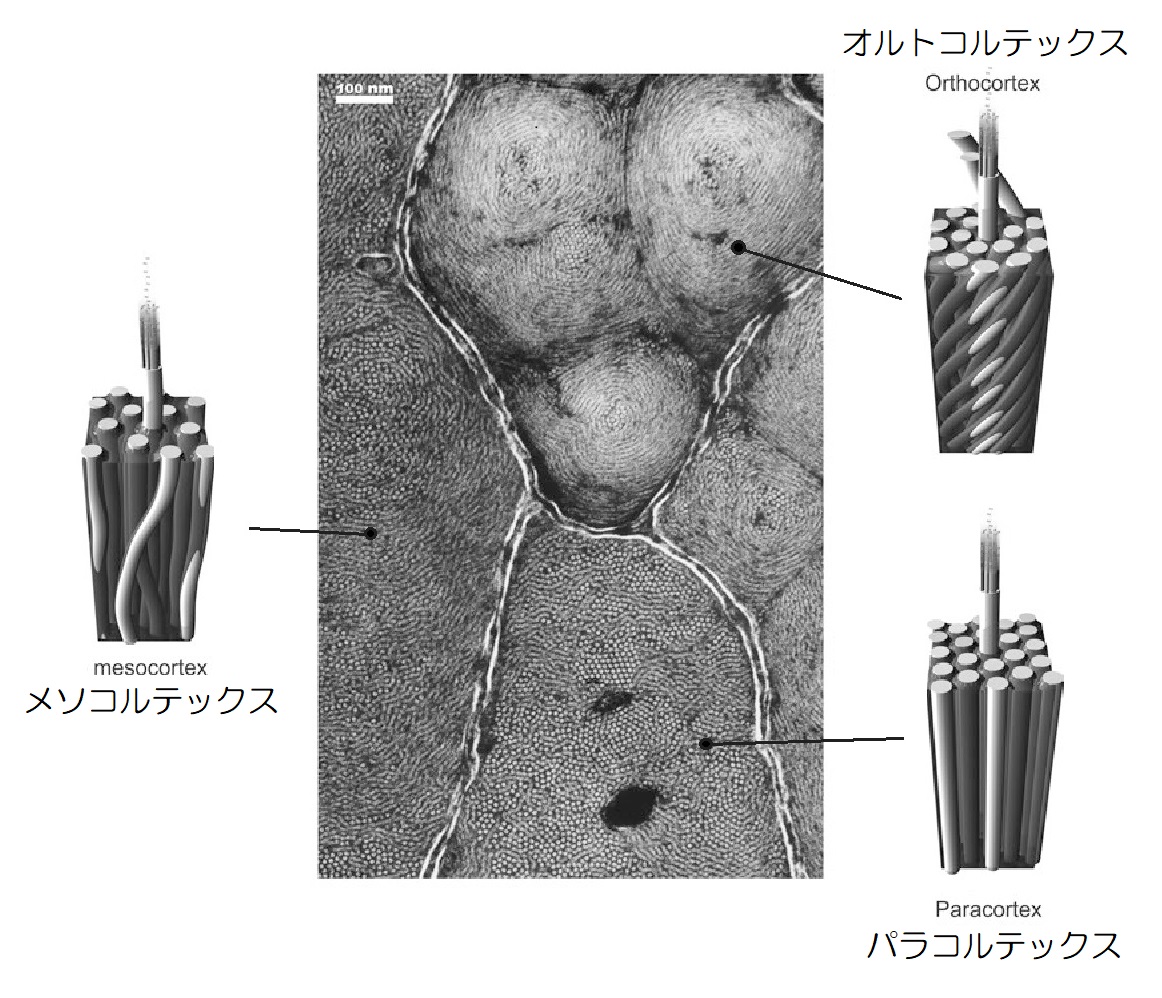 一方、オルトコルテックスはIFが捻じれるように配列していて、メタコルテックスの方はIFがパラコルテックスとオルトコルテックスの中間の捻じれが生じています。