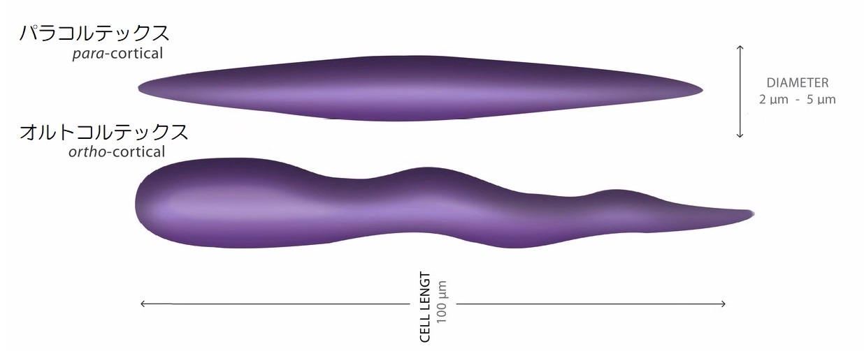 一方、オルトコルテックス細胞は、歪んだいびつな紡錘形をしていて、パラコルテックス細胞より長さがあるのが特徴です。