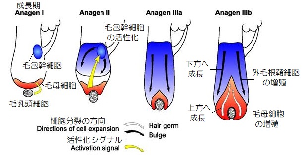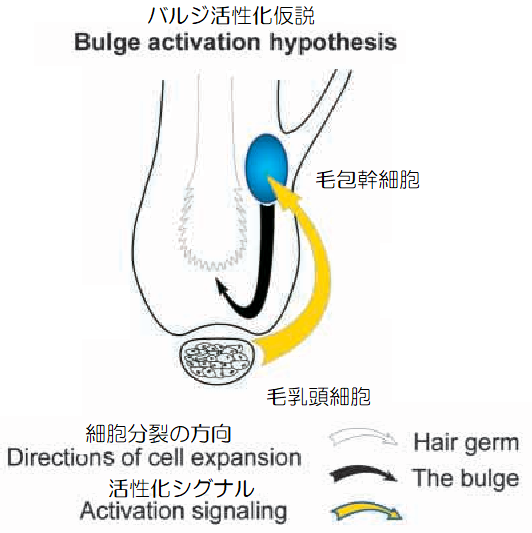 この仮説は、毛包が真皮深くまで侵入している成長期後期中に、毛乳頭細胞から細胞成長因子が放出され、距離的に離れたバルジ領域にある毛包幹細胞に働きかけます。