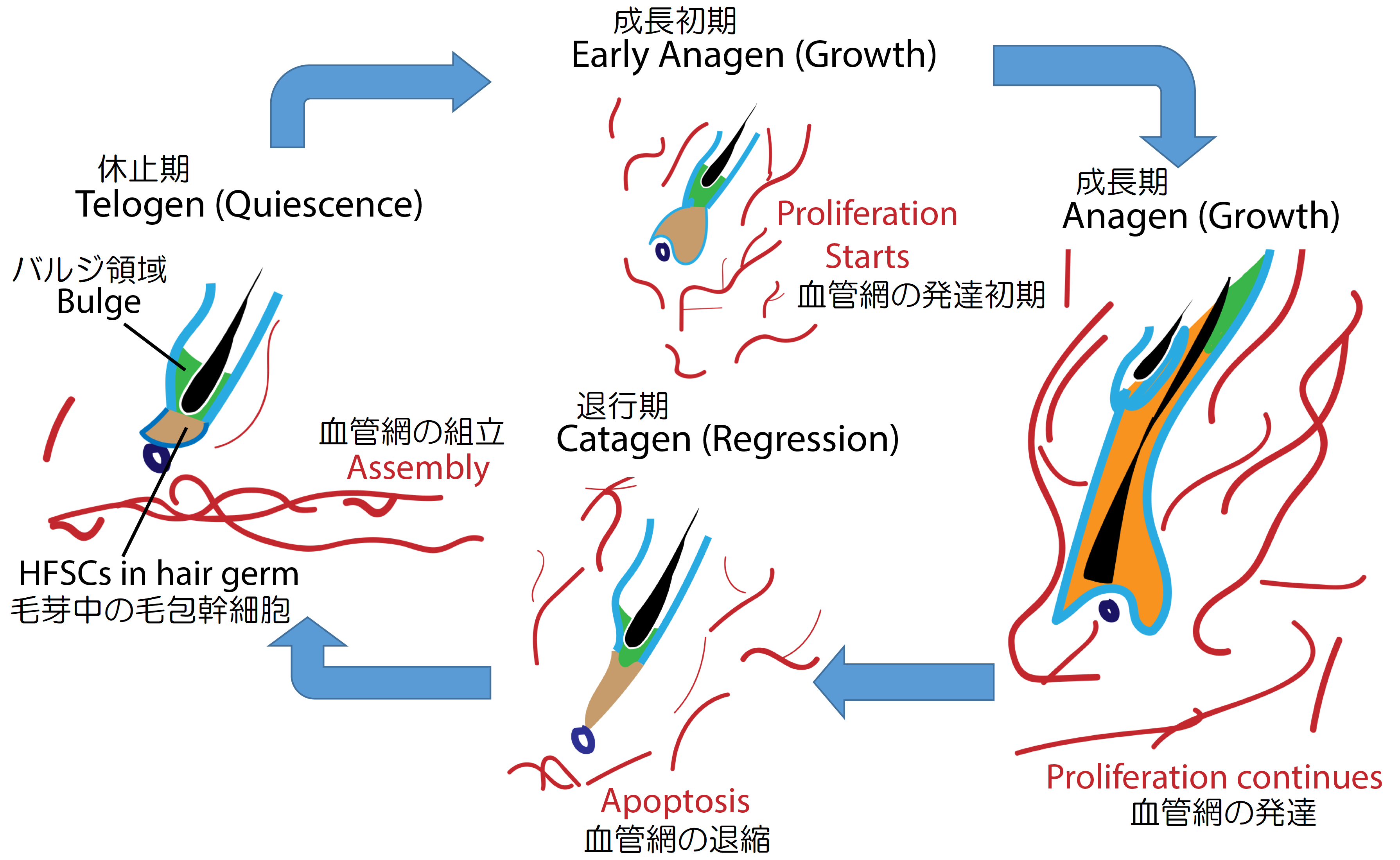 また、毛周期の変化に応じて、結合組織性毛包や毛乳頭内の毛細血管網も、発達したり、退縮したりと変化することが確認されています。