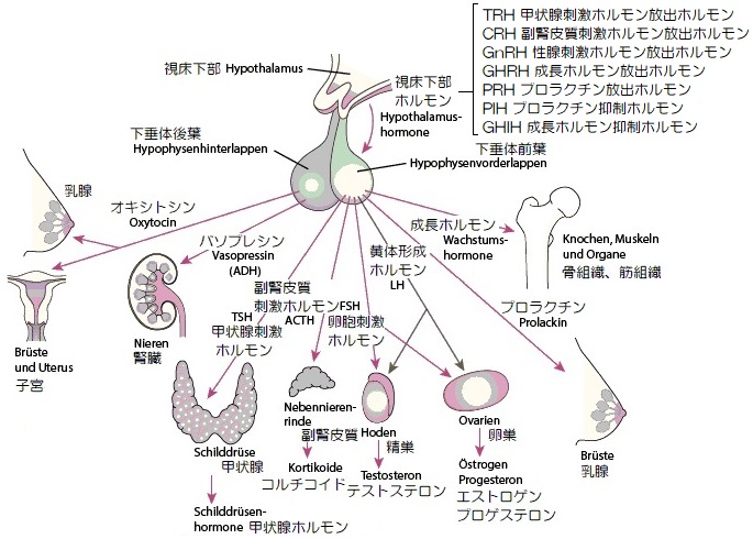 その信号を受けた下垂体の前葉や後葉は、さまざまなホルモンを血中に分泌し、遠く離れた末梢の内分泌腺に対して作用を及ぼします。