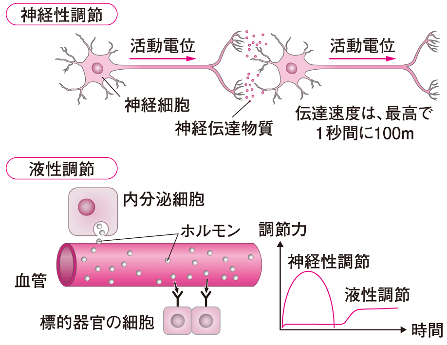 その細胞や組織どうしの情報伝達手段としては、神経細胞による自律神経系(神経節調節)と、ホルモンによる内分泌系(液性調節)があります。
