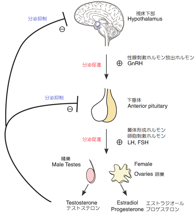 下垂体から放出されたLHやFSHは、男性の精巣や女性の卵巣に働きかけて、テストステロンやエストロゲンの合成、分泌を促したり、精子や卵子の成長を促進させます。