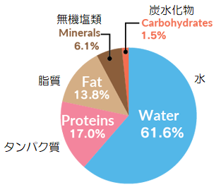ヒトは、その62%という大部分が水であり、タンパク質が17%、脂質が14%、無機塩類が6%、炭水化物(糖質)が1%、残りは核酸などからなります。