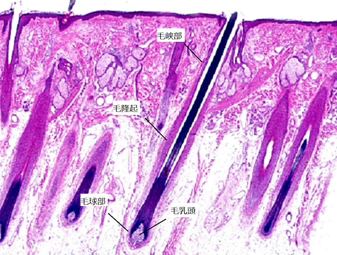外毛根鞘を縦断面でみると、毛球部では1~2層と薄く、毛乳頭の頂点を超えると多層化し、毛隆起部では7~12層程度になり、さらに上方の毛包峡部では、再び薄くなります。