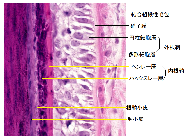 内毛根鞘の最外層であるヘンレ層は、低立方の1層の細胞であり、ハックスレー層は1~3層の丸みを帯びた有核細胞で、内側の鞘小皮は1層の角化した扁平な鱗状の層です。