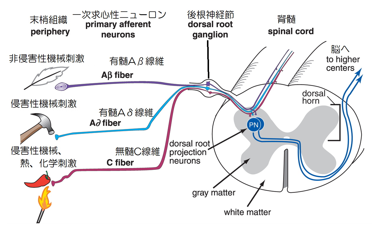 その神経線維の種類には3種類あり、触覚の神経線維は有髄Aβ線維で、痛覚(鋭い痛み)の神経線維は有髄Aδ線維、痛覚(鈍い痛み)や温度、痒みの神経線維が無髄C線維です。