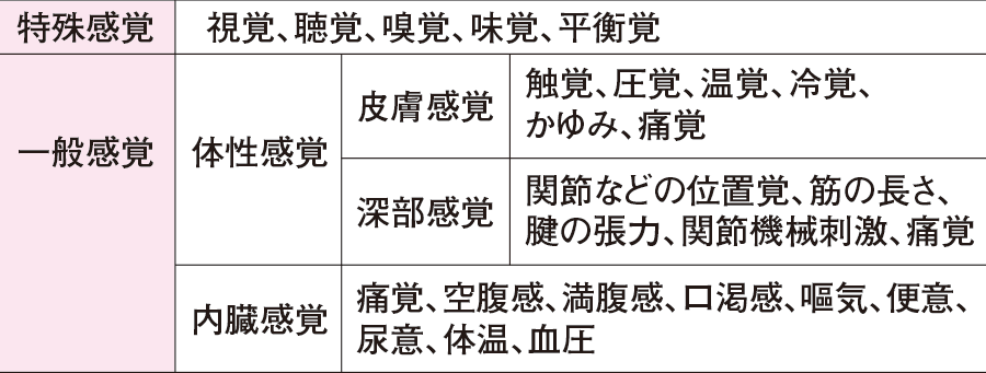 それ以外は一般感覚と呼ばれ、さらに皮膚などで感じる「皮膚感覚」、筋肉などの動きを感じ取る「深部感覚」、臓器の状態を感じる「内臓感覚」に分けられます。