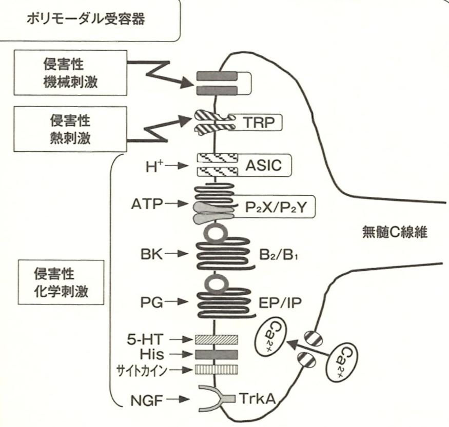 一方、鈍い痛みを受け取る無髄C線維の神経終末には、ポリモーダル受容器と呼ばれる、さまざまな受容体やイオンチャネルが埋め込まれた特殊な構造があります。